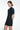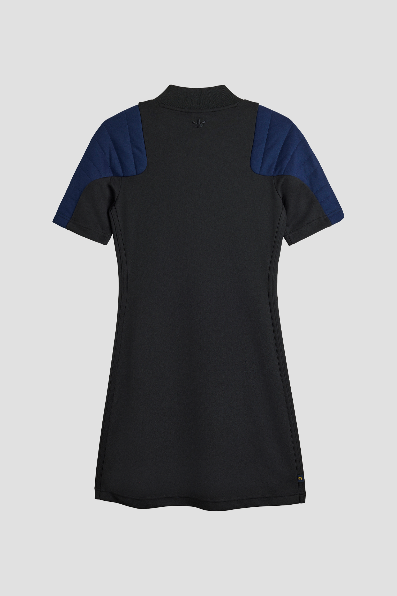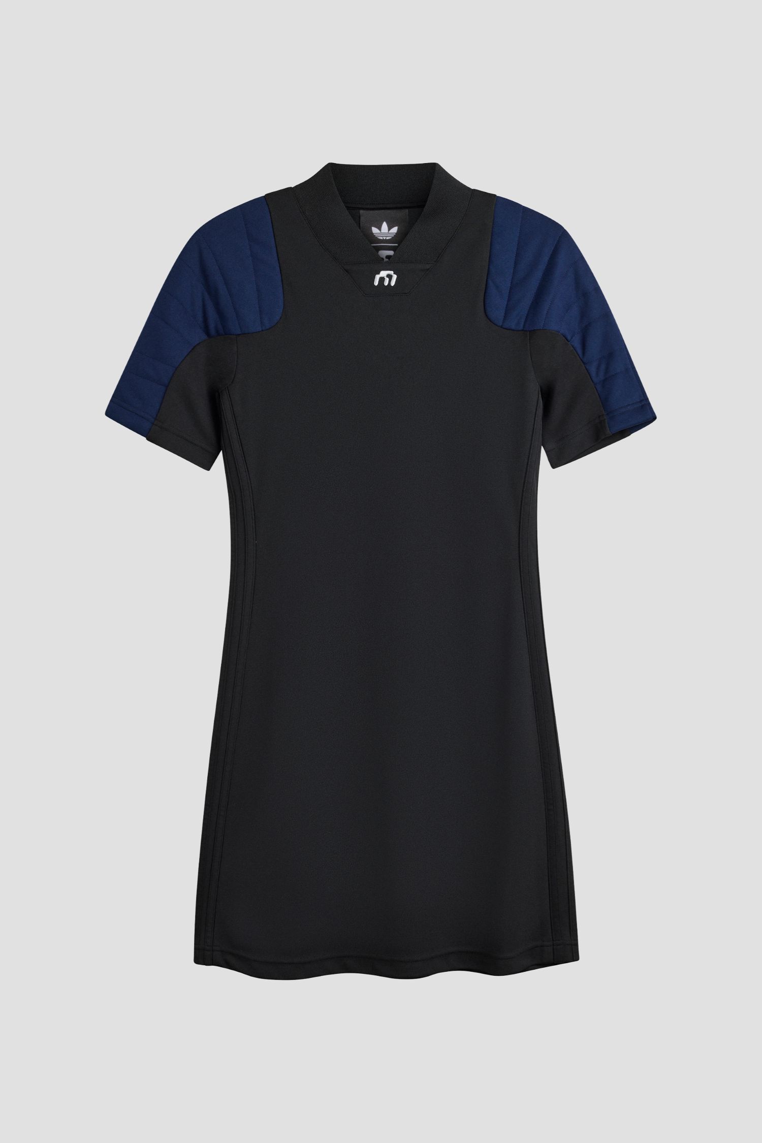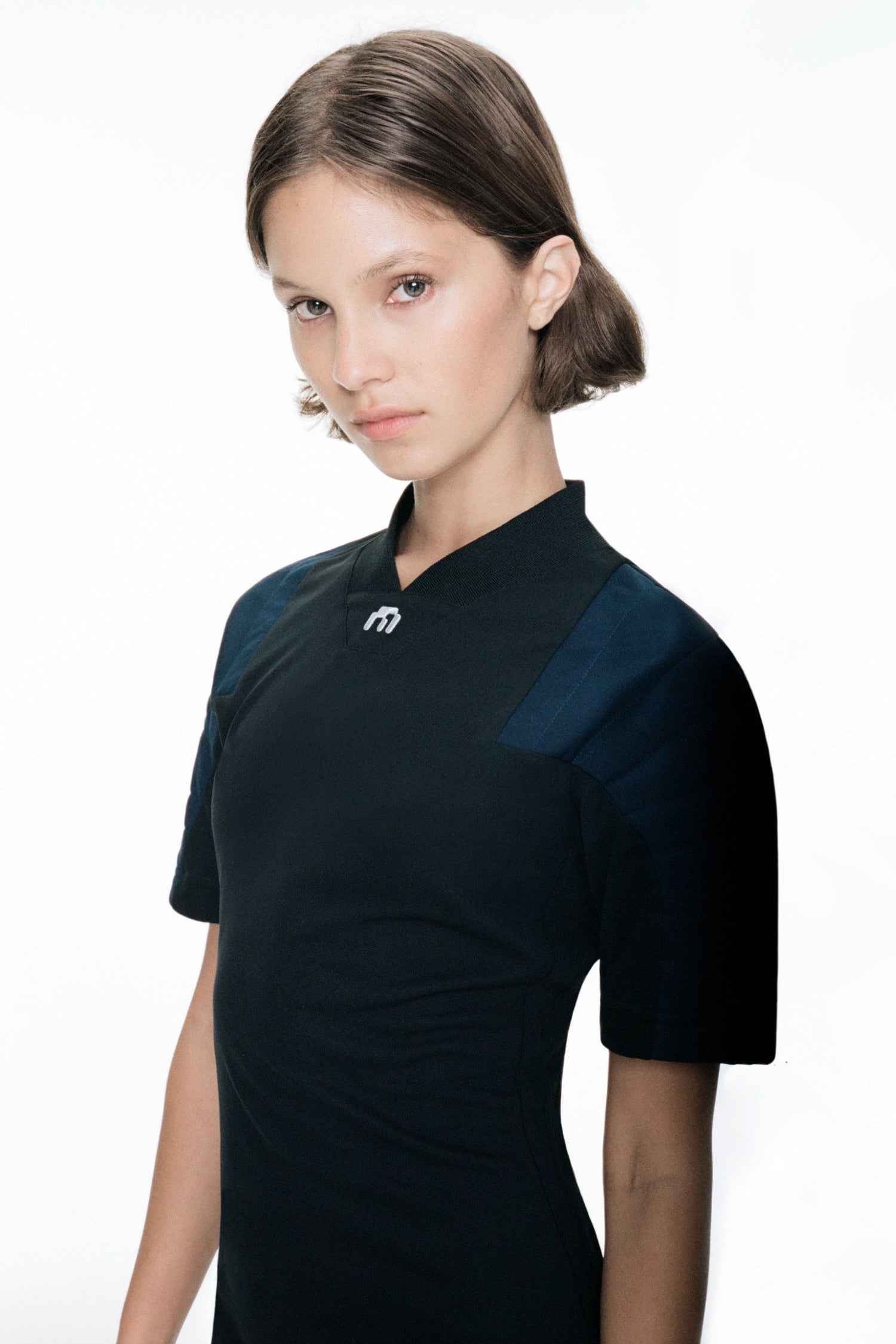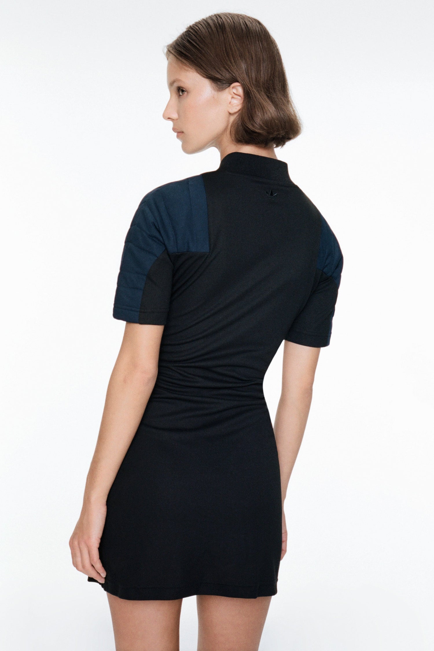 Sporty black dress with navy padded sleeves in a comfortable, flattering woven fabric.