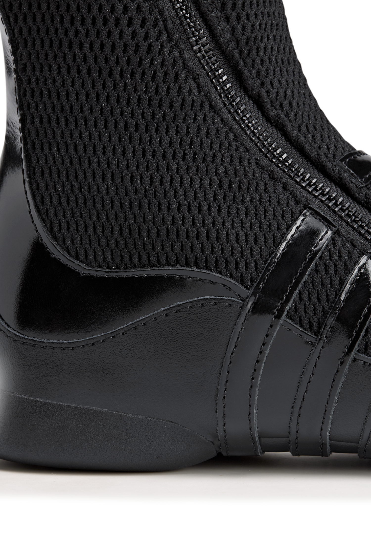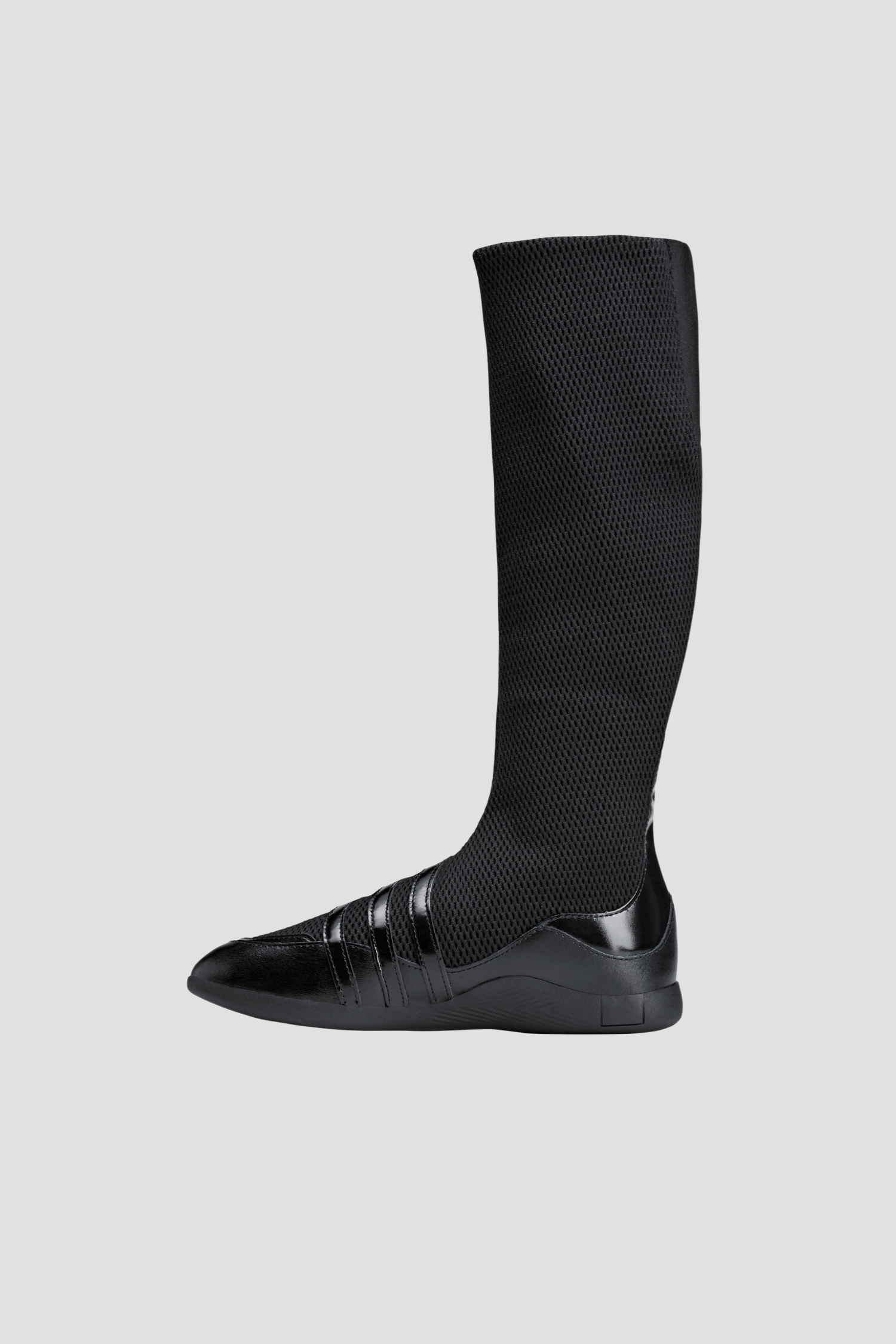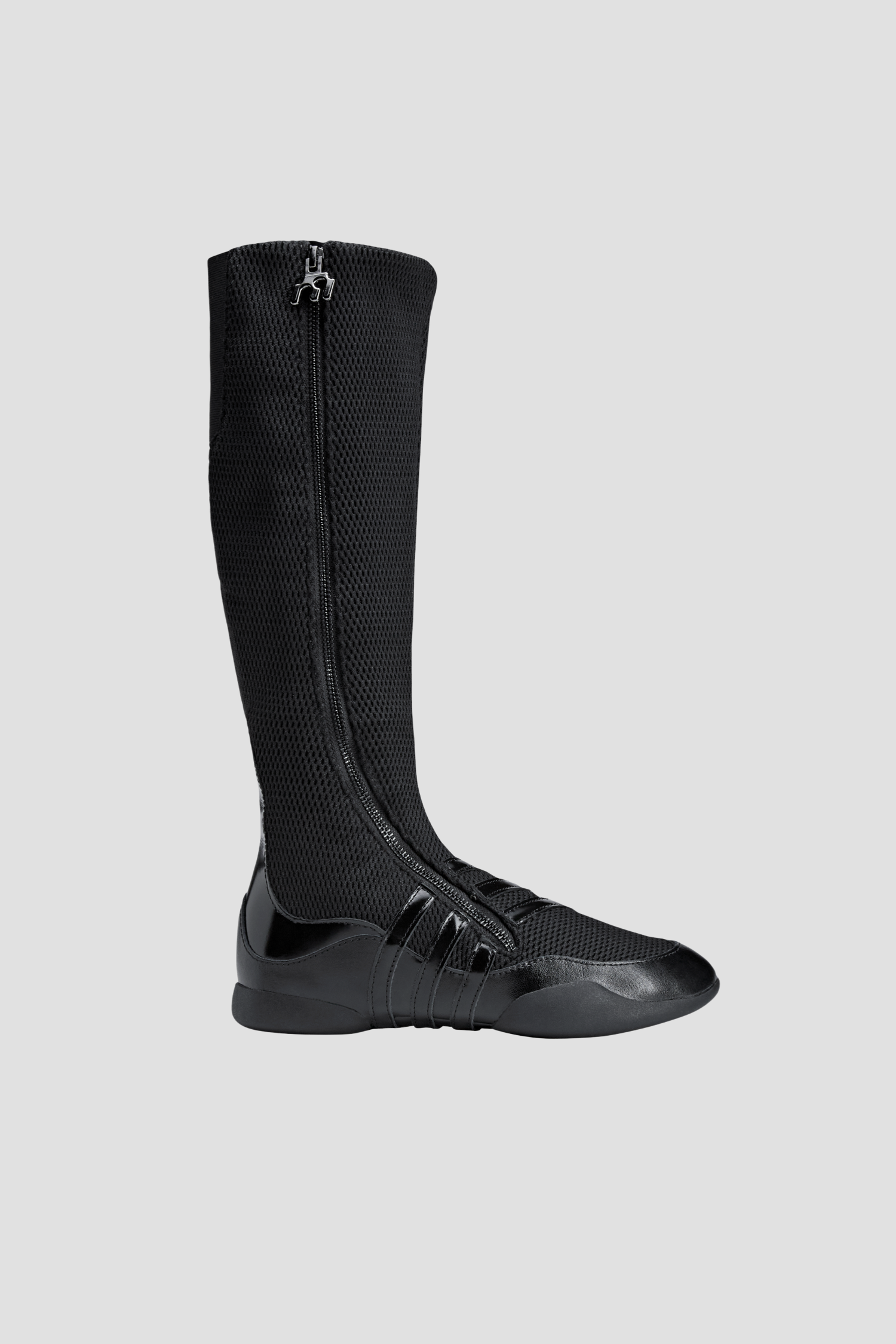 Miaou's latest collaboration shoe with Adidas. Adding dramatic height to the low profile look, the Miaou Boot takes adidas’ Taekwondo tooling and reimagines it with a high cut mesh body with leather Three Stripes and a black metallic “M” branded zip pull. Leather and textile boots with rubber outsole for a premium feel and lasting durability.