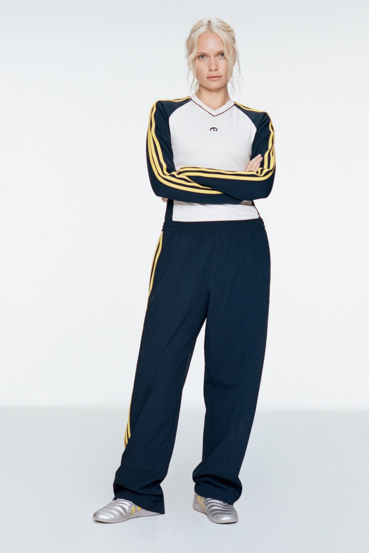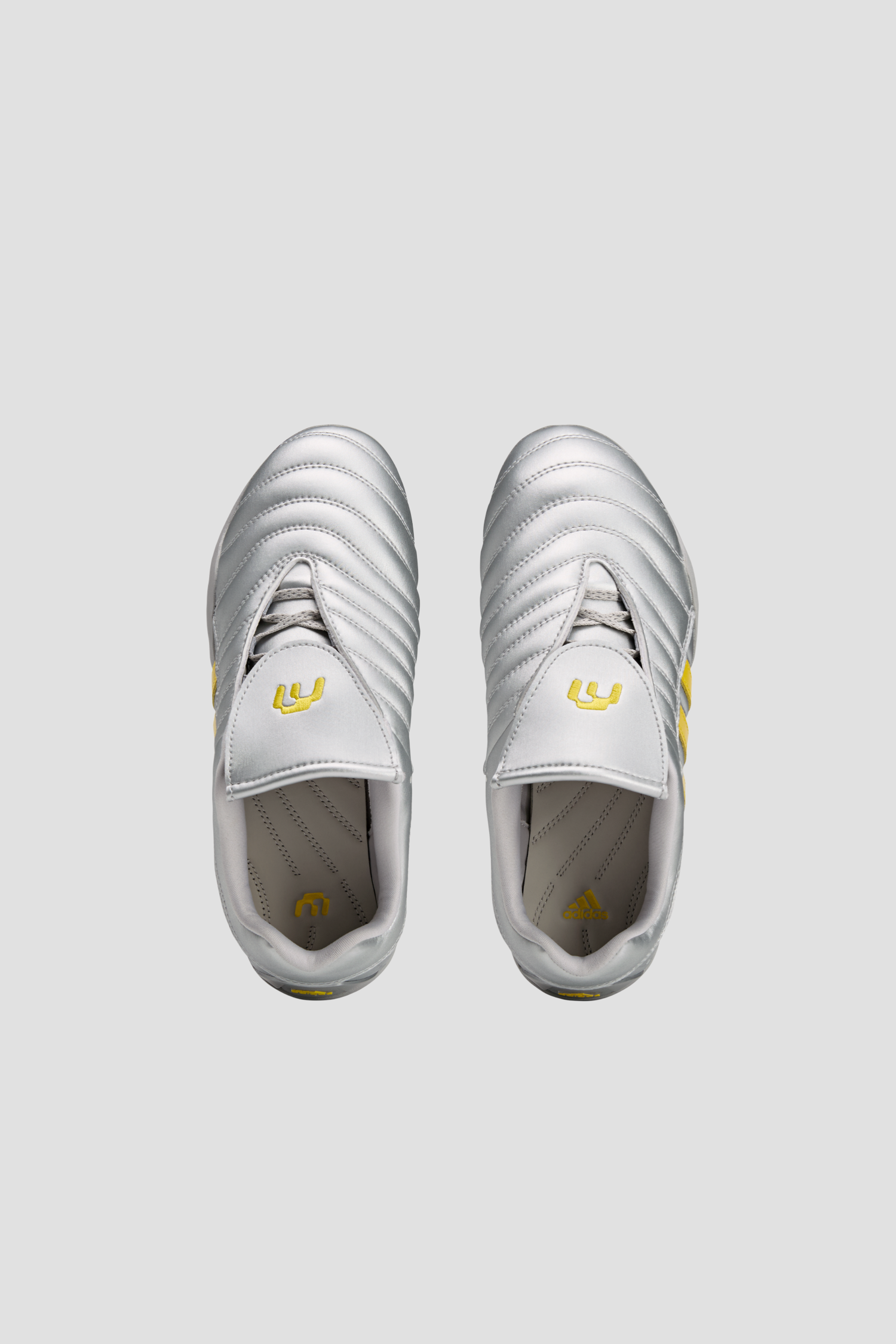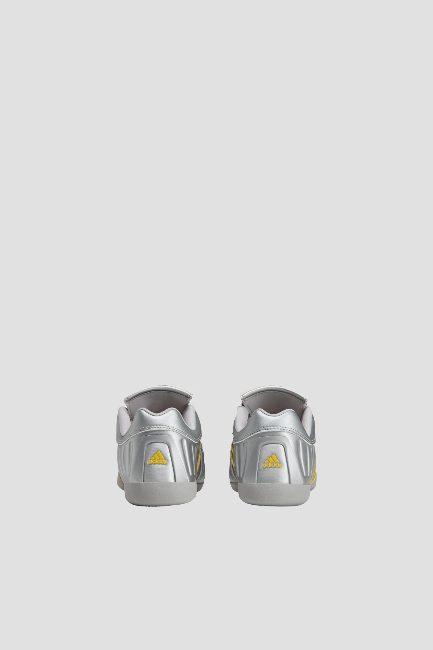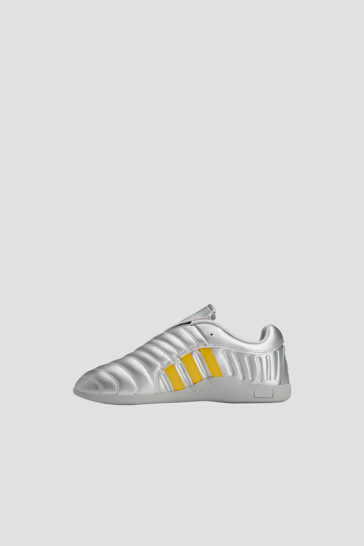 Miaou's latest collaboration shoe with Adidas, celebrating sportiness and sensuality. The Elite Mei features a silver satin upper with contrasting yellow stripes and embroidered “M” branding on the tongue. Comes with an extra pair of silver laces.