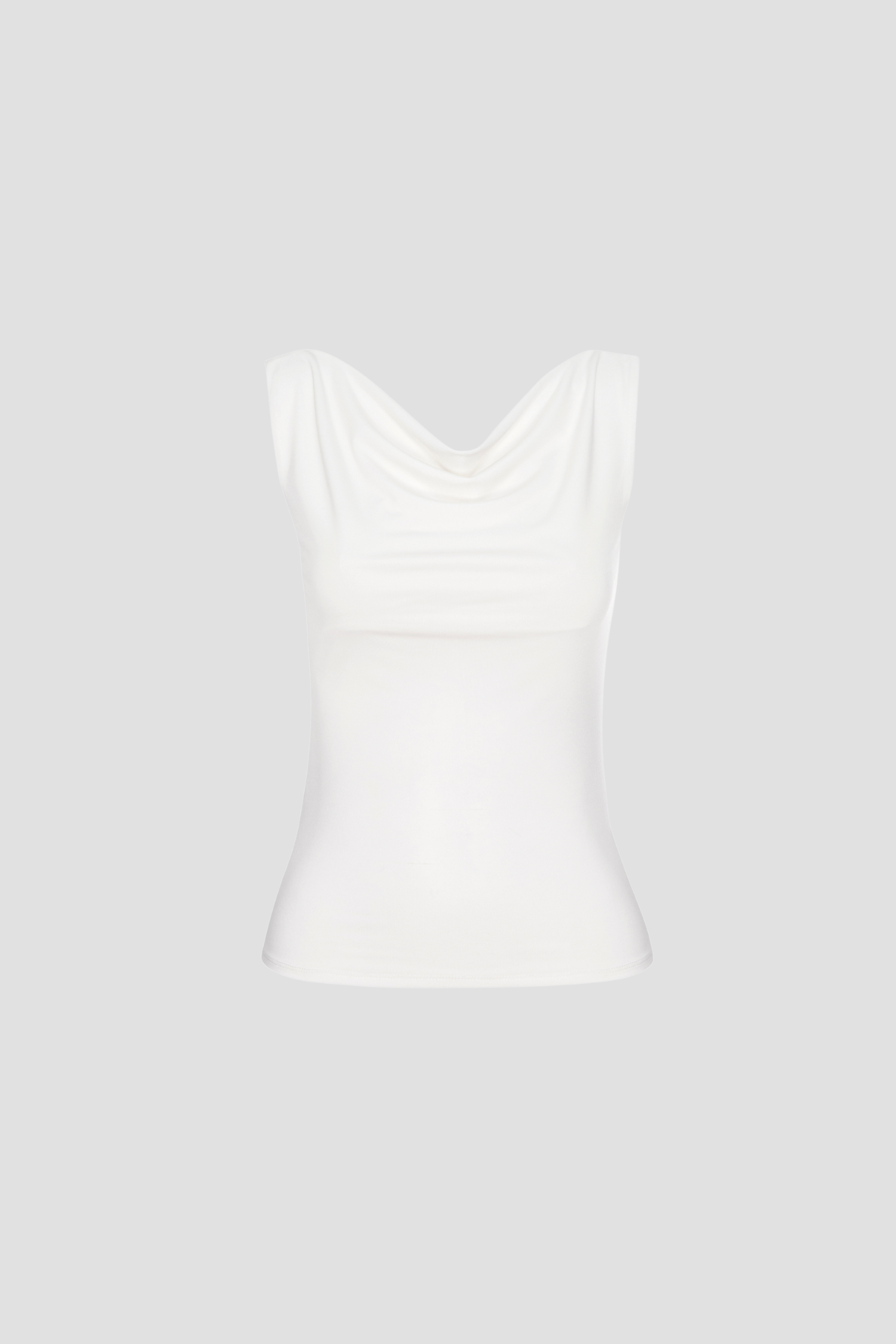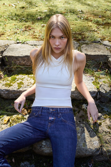 Meet the Lani Top in White. With her cinched waist and cowl neckline, this sleeveless tank complements your body perfectly. Styled with our new Low Rise Flare Jean.