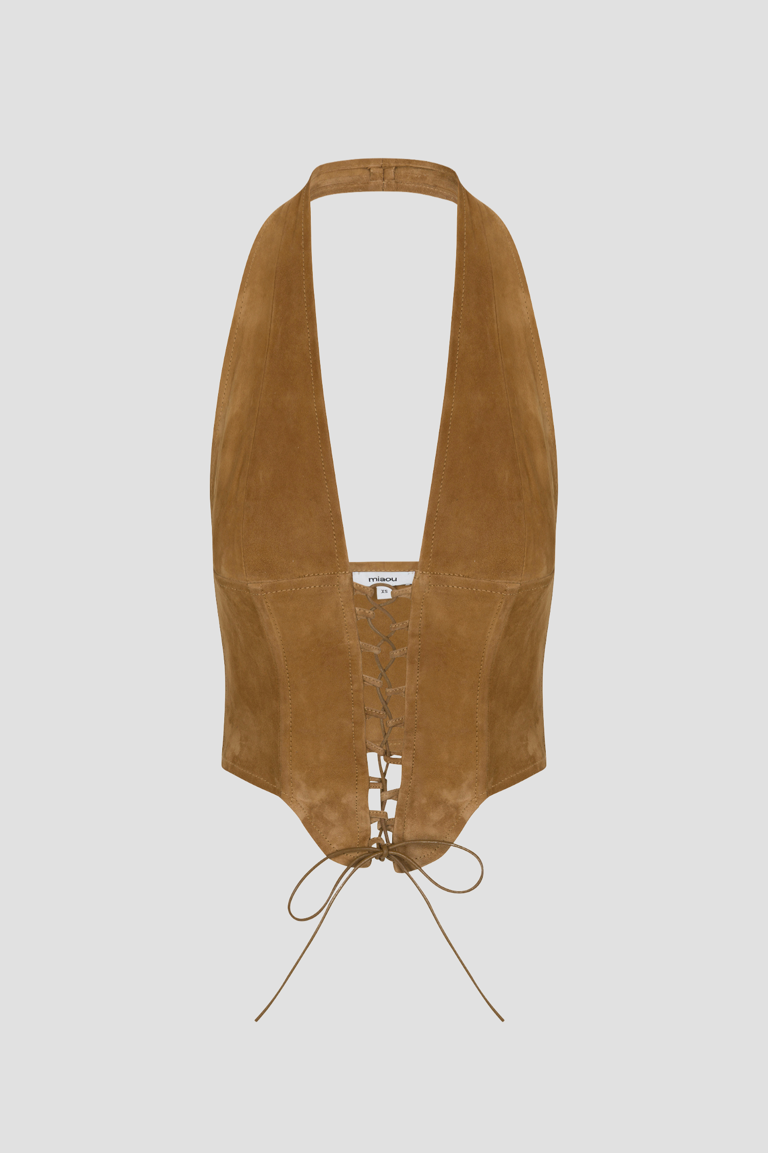 The Mara Corset - now in Tan Suede. Features a plunging halter neckline, fully fastened with front lace-up closure.