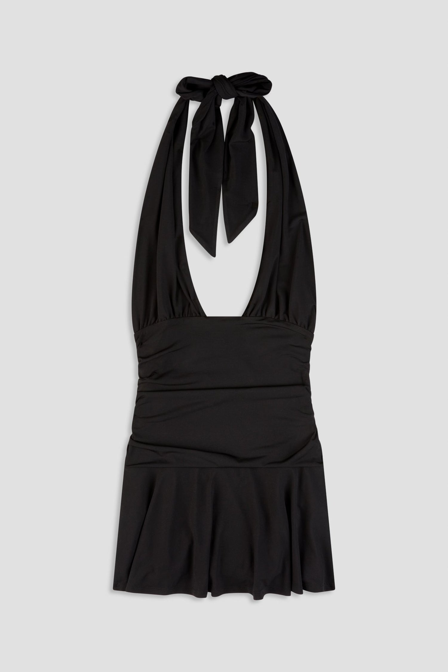 The Natalia is our best-selling little black dress. She features a tie-halter, waist ruching, and a flared, flowy mini skirt with built-in shorts. Perfect for day or night.