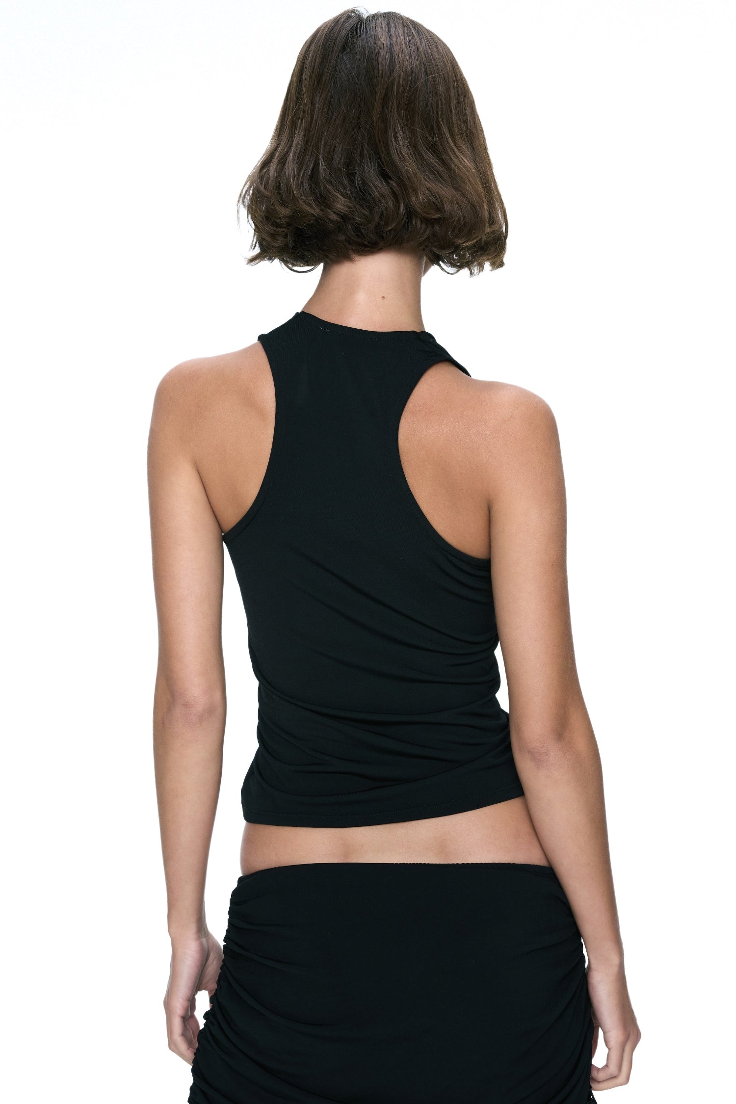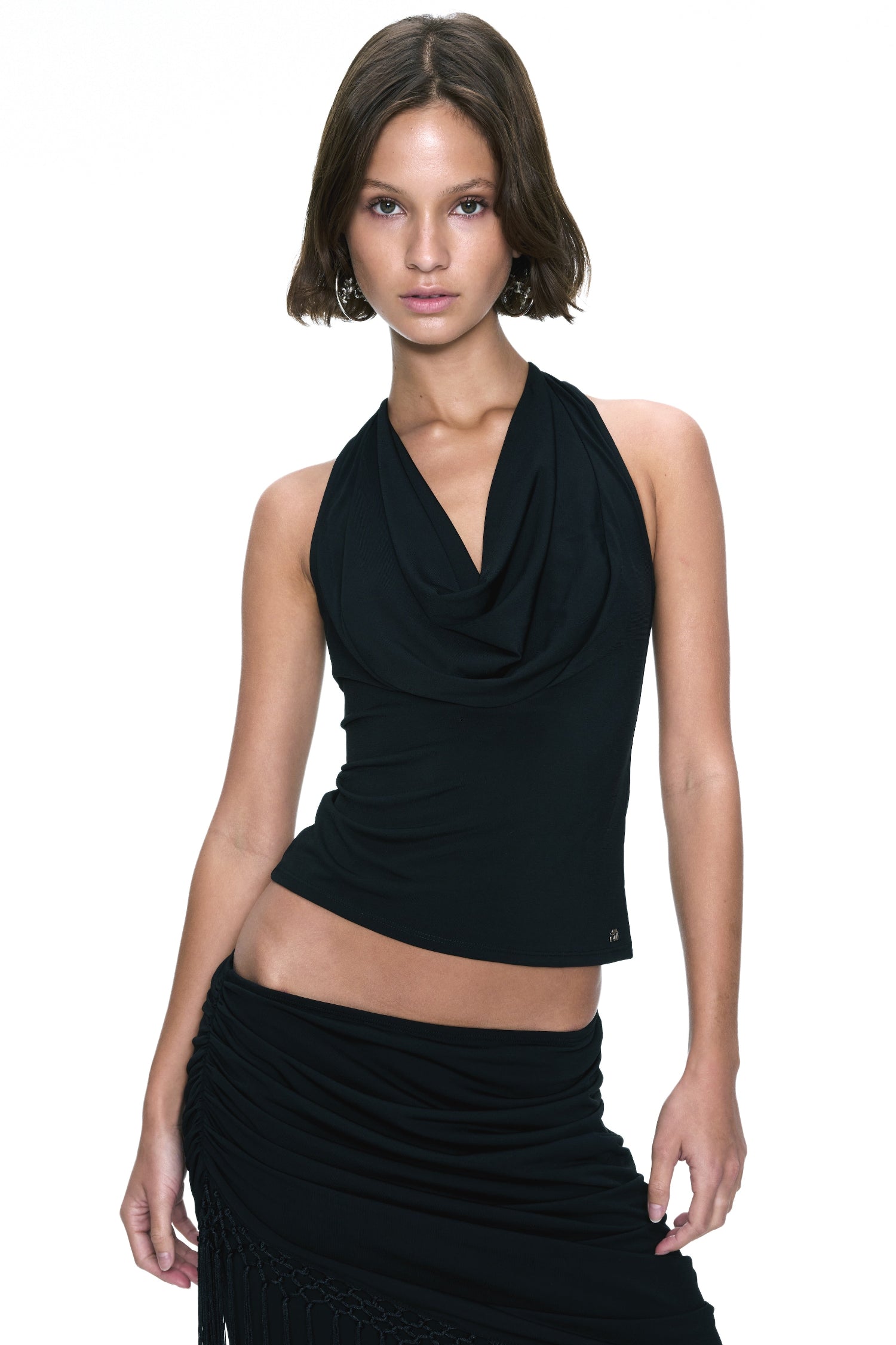 The Renee Top features a draped cowl neckline and a racerback with smooth, body-skimming stretch fabric. Refined and effortless, she was made for after-dark styling.