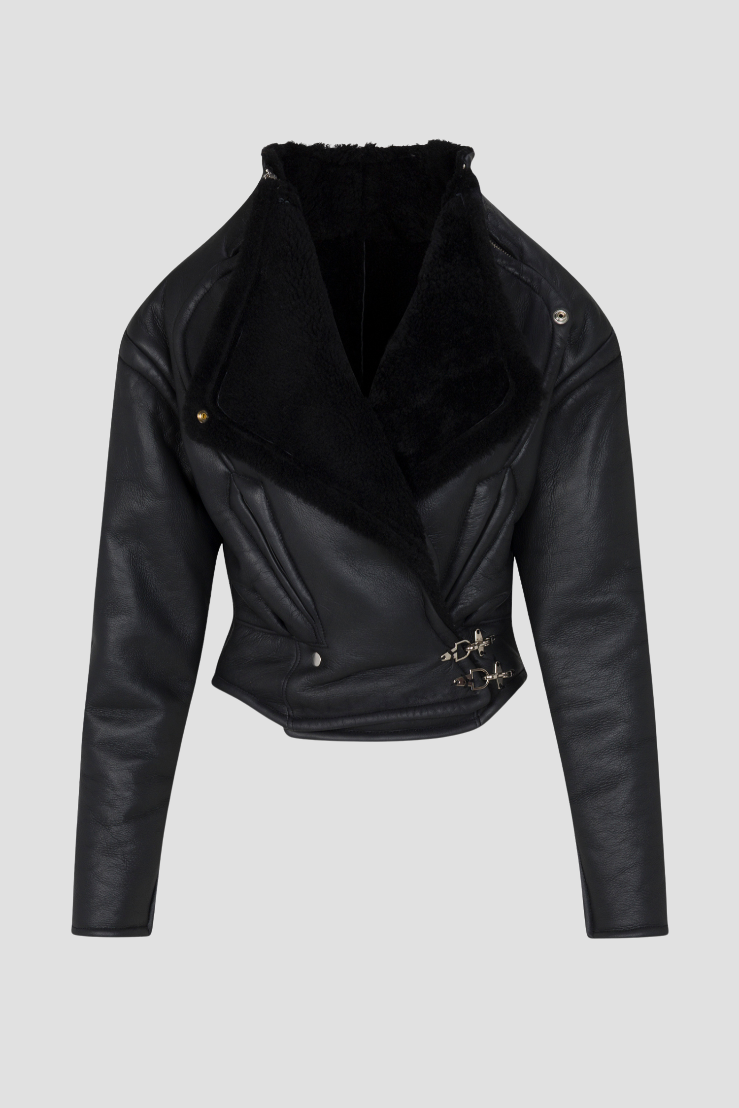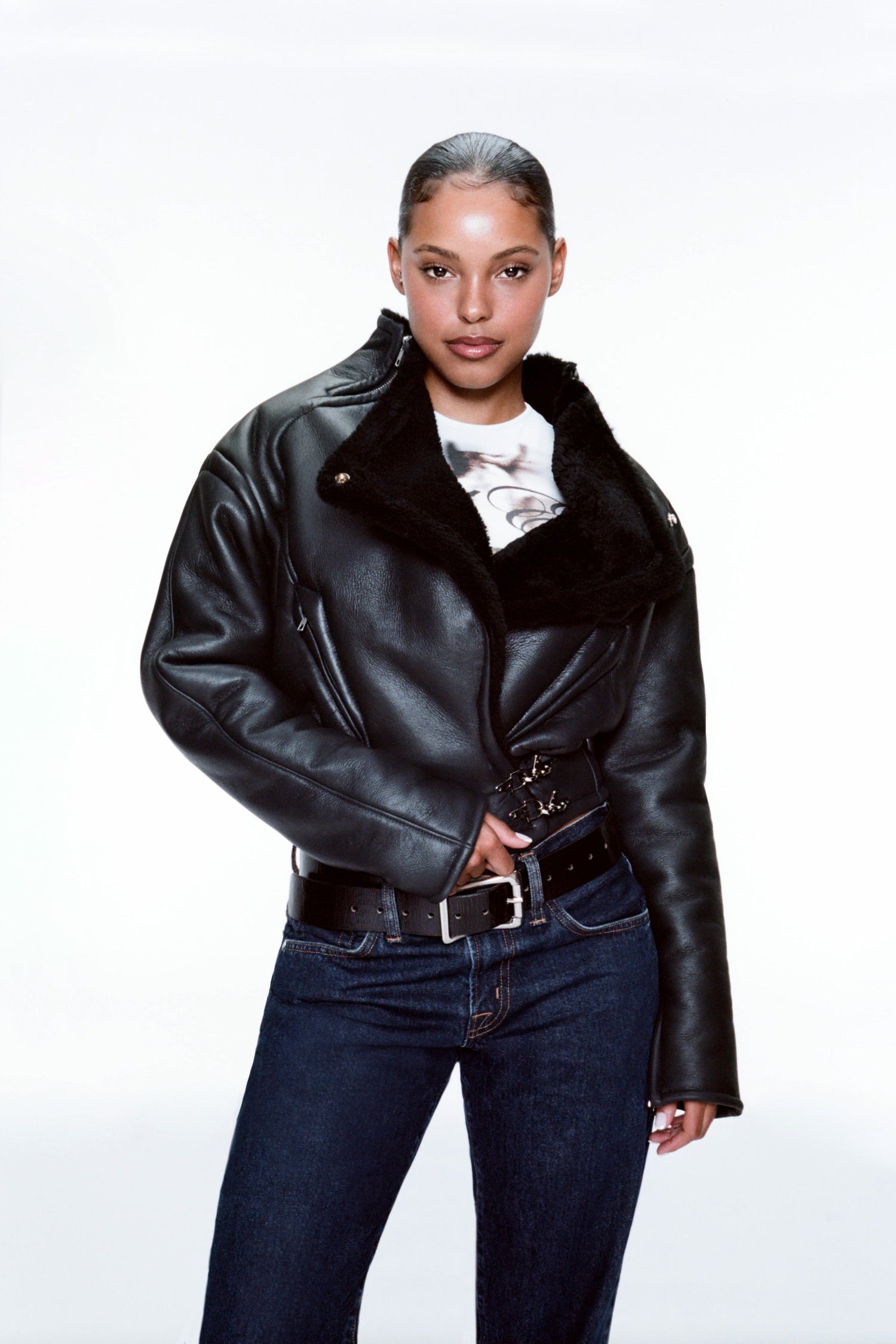 The Isiola Leather Jacket nods to the women who came before us — their power, poise, and presence. Broad raglan shoulders evoke vintage silhouettes from our archive, while soft shearling accents and supple leather reimagine that strength through a distinctly modern, Miaou lens.