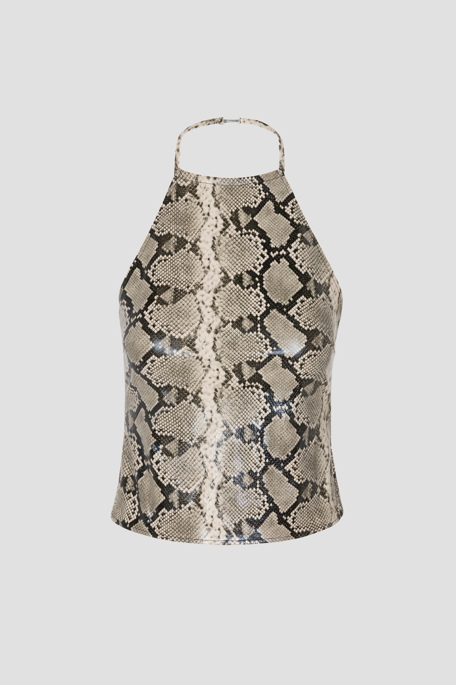The Natalia Top gets a new look in python-print vegan leather. With a halter neckline, side zipper, and an open back, she’s sleek, striking, and pairs perfectly with the Kira Skirt.