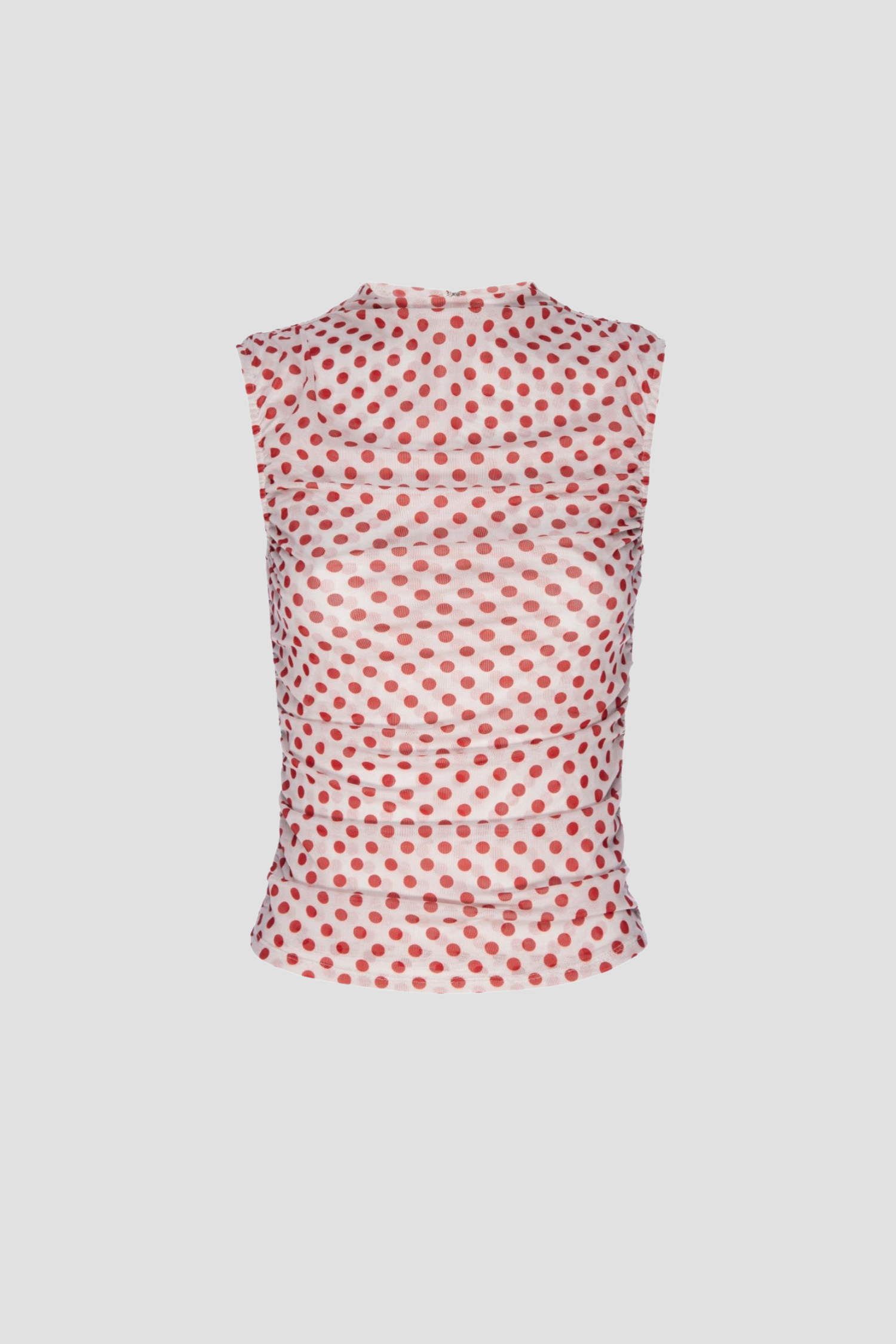 Meet our Cam Top, in White Polka Dot. Composed of our supportive, and form-fitting mesh yet, this top is a sheer, sleeveless little number featuring a high neckline, ruching, and back zipper. She is not to be missed.