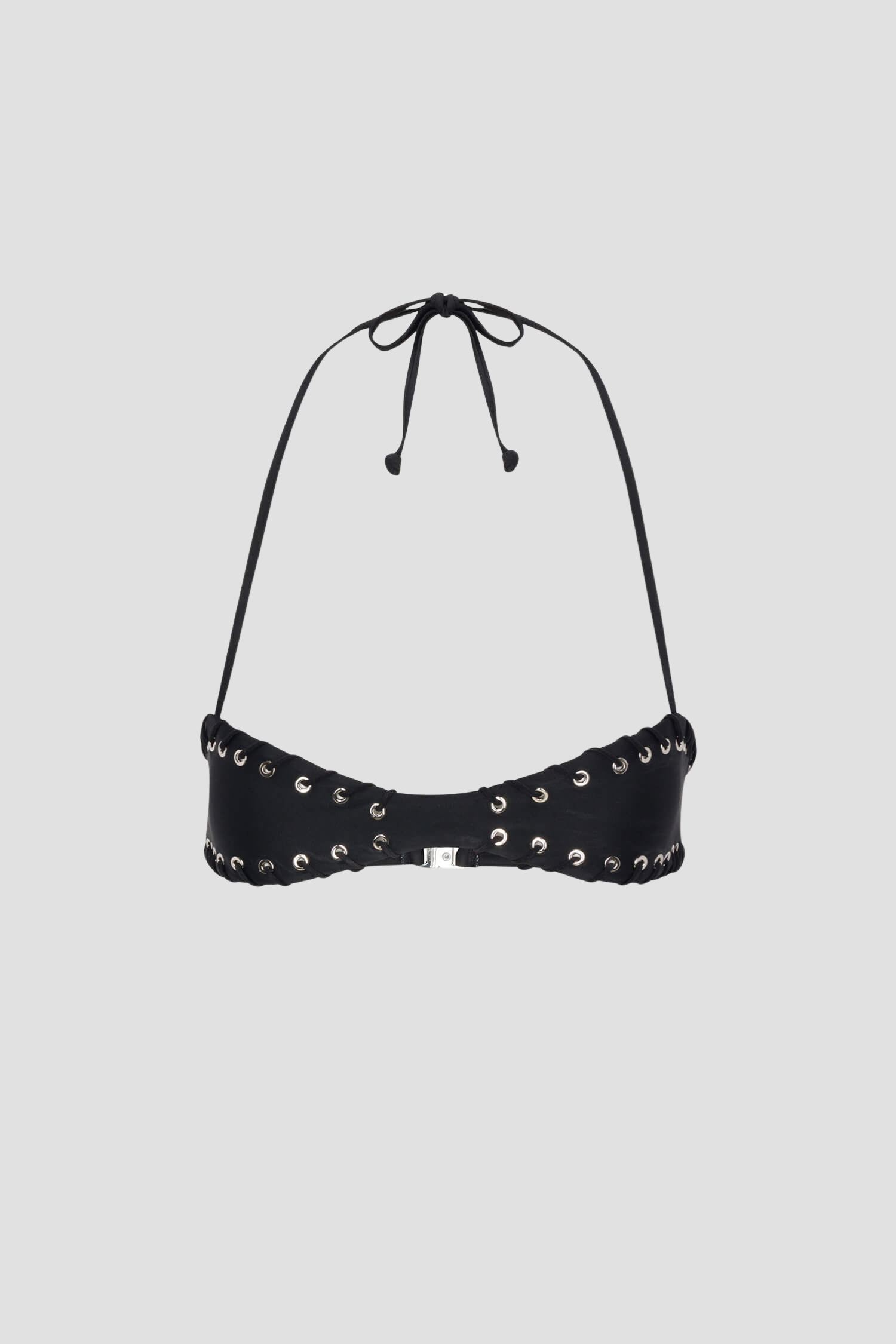 Introducing our Rio bikini top, in Black. She's a halter bikini with all-around laced stitch detailing. She covers just the essentials, so wear her wisely. Pair her with the matching Rio bottoms for a sexy fit.
