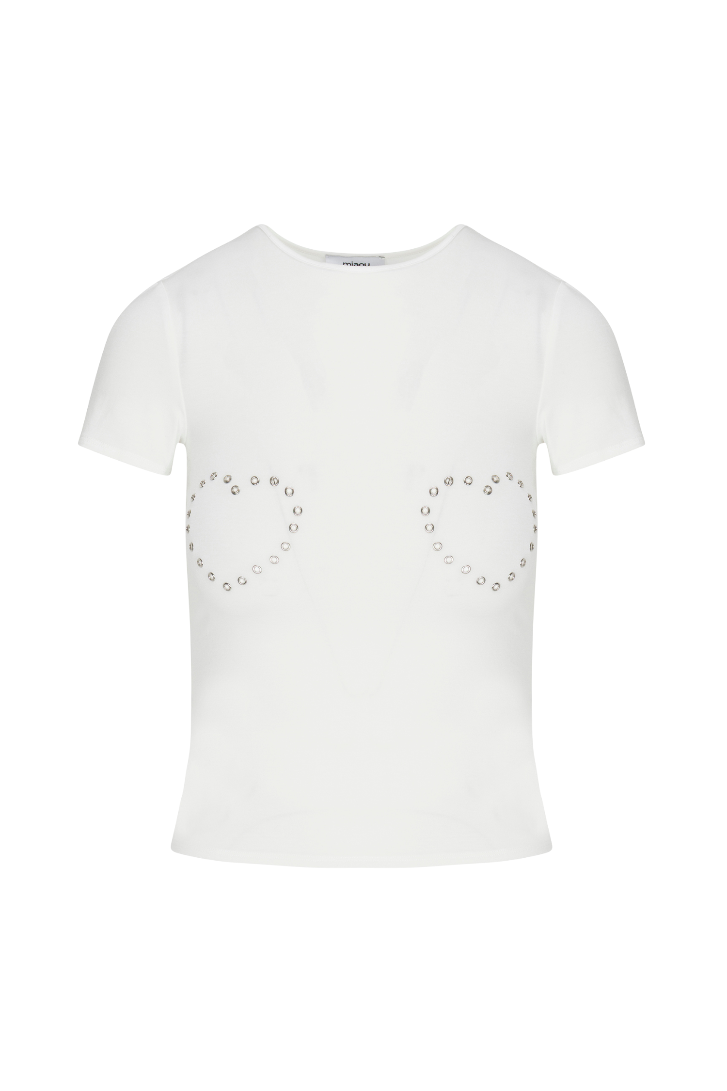 The Mini Tee is back in white lightweight Tencel jersey, finished with double heart-shaped grommets at the chest. Soft and fitted, she’s the playful essential you’ll reach for again and again.