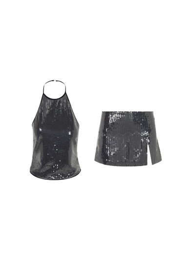 Set includes Natalia Top and Micro Mini Skirt in Black Sequin.